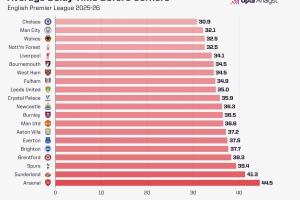 Opta統(tǒng)計(jì)2025/26賽季英超各隊(duì)角球前平均延誤時(shí)間(從少到多排序)↓