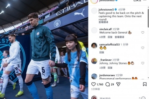 斯通斯社媒曬出比賽照片,慶祝復(fù)出,配文:“重返賽場并擔(dān)任隊(duì)長感覺真好,晉級下一輪!”