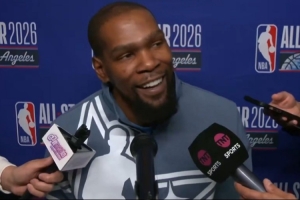 體育資訊2月16日訊 NBA全明星正賽冠軍賽,美國星條隊21-47不敵美國新星隊。賽后,杜蘭特接受了記者采訪。