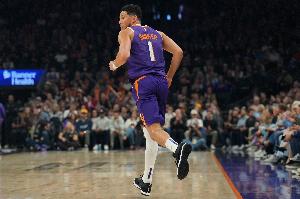 賽后,美國(guó)新星隊(duì)隊(duì)員、太陽(yáng)球星德文·布克參加了新聞發(fā)布會(huì)。