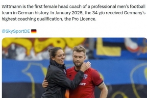 報(bào)道稱維特曼自2024年5月起擔(dān)任該隊(duì)主教練。她是德國歷史上首位執(zhí)教職業(yè)男子足球隊(duì)的女性主教練。2026年1月,34歲的她獲得了德國最高級別的教練資格——職業(yè)級教練證書。