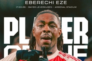 歐冠1/8決賽次回合,阿森納2-0擊敗勒沃庫森,兩回合總比分3-1取勝晉級8強(qiáng)。次回合比賽,埃澤打入一記精彩的世界波破門,他也被球迷票選為阿森納隊(duì)內(nèi)最佳球員。