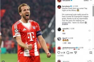 凱恩社媒曬出慶祝進(jìn)球的照片,配文:“四分之一決賽,我們來了!安聯(lián)球場的精彩夜晚!”