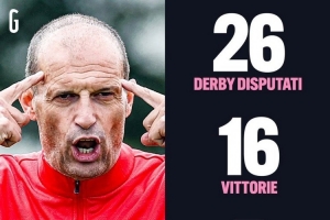 阿萊格里此前共26次帶隊(duì)出戰(zhàn)米蘭德比+都靈德比,戰(zhàn)績16勝5平5負(fù)