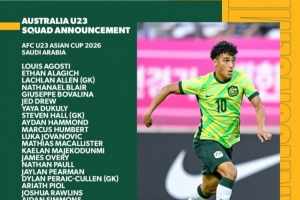 體育資訊1月4日訊 今日,亞足聯(lián)官方公布參加U23亞洲杯各隊(duì)球員名單及球員號(hào)。本次澳大利亞U23自預(yù)選賽以來,再度與U23國足同組,他們的球員名單和球衣號(hào)如下: