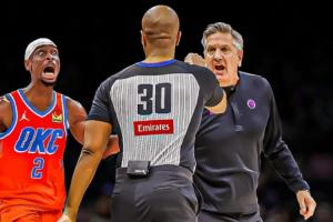 體育資訊01月07日訊 在此前森林狼戰(zhàn)勝雷霆的比賽首節(jié),芬奇因?yàn)椴粷M判罰當(dāng)場(chǎng)暴怒,直接被裁判驅(qū)逐。